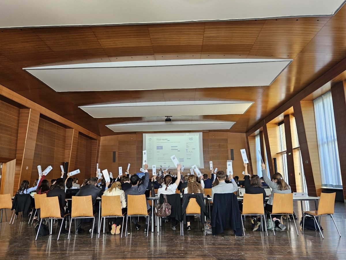 Im Rahmen der Simulation der Vereinten Nationen vertraten unsere Delegierten die Länder Schweiz, Panama, Chile, Guyana, Eritrea, Argentinien, Nigeria und Honduras. In formellen Debatten und informellen Verhandlungen erarbeiteten sie Resolutionen zu aktuellen globalen Herausforderungen. In der Generalversammlung wurde unter anderem die hochaktuellen Themen "Die Verhinderung ausländischer Einflussnahme auf nationale Wahlen" und "Der Schutz globaler Konnektivität" behandelt, während in der Kommission für Verbrechensbekämpfung und Strafrechtspflege der illegale Drogenhandel und der Missbrauch von künstlicher Intelligenz auf der Agenda standen.
