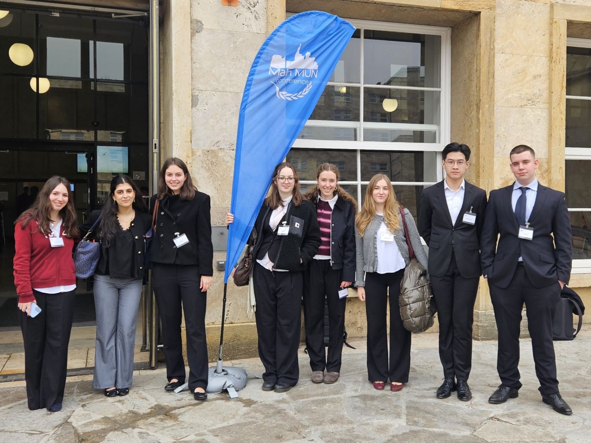 Vom 26. Februar bis zum 1. März 2026 nahmen sechs Schülerinnen und zwei Schüler der E- und Q-Phase an der MAIN MUN Konferenz an der Goethe-Universität in Frankfurt teil. Unter dem diesjährigen Motto „Daring Democracy – Demokratie wagen“ setzten sich die Teilnehmenden intensiv mit der Frage auseinander, wie demokratische Werte weltweit gestärkt, geschützt und weiterentwickelt werden können. Darüber hinaus ging es auch darum, sich selbst zu wagen: eine Rede vor internationalem Publikum zu halten, an informellen Diskussionen teilzunehmen und stets den sogenannten MUN-Kompass neu auszurichten – also konsequent die Position des zugeteilten Landes zu vertreten. So beteuerte auch Alissa Lingnau in ihrer Eröffnungsrede „Selbstbewusstsein kommt nicht vor der Rede, sondern danach.“