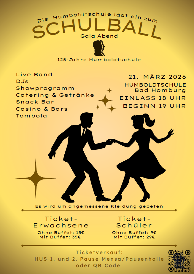 Mit unserem Schulball am 21. März 2026 möchten wir mitten im laufenden Schuljahr einen festlichen Akzent setzen – einen Abend, der uns als Mitglieder einer lebendigen Schulgemeinschaft zusammenführt. Dieser Ball bietet uns die Gelegenheit, Schule einmal anders zu erleben: nicht zwischen Unterricht, Hausaufgaben und Klausurvorbereitung, sondern in festlicher Atmosphäre.